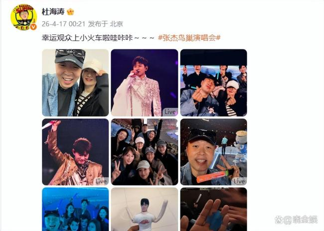 杜海涛晒张杰老鼠干 演唱会现场欢乐互动!男主播杜海涛出席了《张杰未LIVE-开往1982演唱会巡演》,而他的妻子沈梦辰并未现身。2026年4月17日凌晨,前湖南卫视著名电视综艺节目主持人杜海涛在个人社交平台上发文并分享了十五张现场照片。