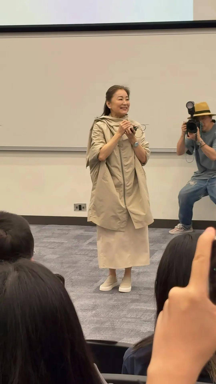 有參與講座的學生在社交平台分享了講座的照片及片段,更興奮留言表示:「真的是太有氣質了,感覺歲月對她留下的是溫柔的痕跡,連皺紋都是如此自然。出場時候的成熟體面,離場時的活潑,輕松面對一切,引得在場各位老老少少都為她驚嘆喝彩」。片段中林青霞穿上淺藍色恤衫,外面陪襯大地色長外套及長裙,造型優雅又知性。