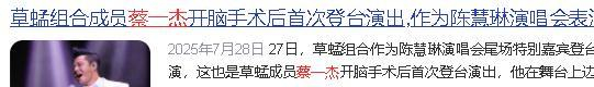 打开网易新闻 查看精彩图片2025年7月,蔡一杰以特邀嘉宾的身份出现在陈慧琳演唱会的尾场。这是他开颅手术后第一次公开站上舞台。