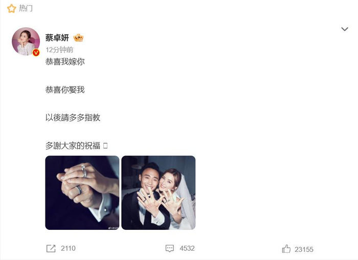 阿Sa蔡卓妍官宣结婚,晒出婚纱照和钻戒