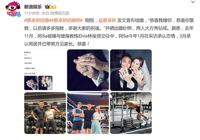 4月28日,娱乐圈又迎来一桩大喜事。43岁的香港艺人蔡卓妍(阿Sa)在微博直接甩出婚纱照和钻戒,官宣与小10岁的健身教练男友Elvis林俊贤结婚,配文简单又深情:“恭喜我嫁你。恭喜你娶我。以後請多多指教。多謝大家的祝福。”一句“恭喜我嫁你,恭喜你娶我”,直接把全网甜到齁,评论区瞬间被祝福声淹没。