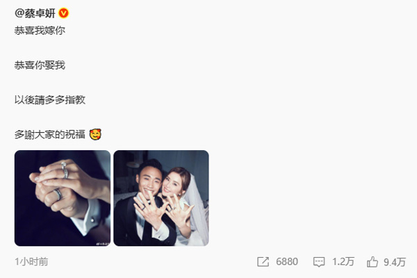看点网讯www.zlook.com 4月28日,娱乐圈迎来一桩喜事。今天中午,蔡卓妍(阿Sa)在社交平台发文宣布结婚,配文甜度爆表:“恭喜我嫁你,恭喜你娶我,以后请多多指教,多谢大家的祝福。”