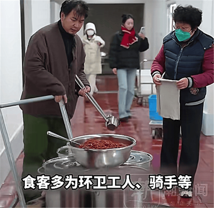 来吃饭的人里,有风吹日晒的环卫工人、奔波不停的外卖骑手,有独自就餐的老人,也有带着孩子的家长。