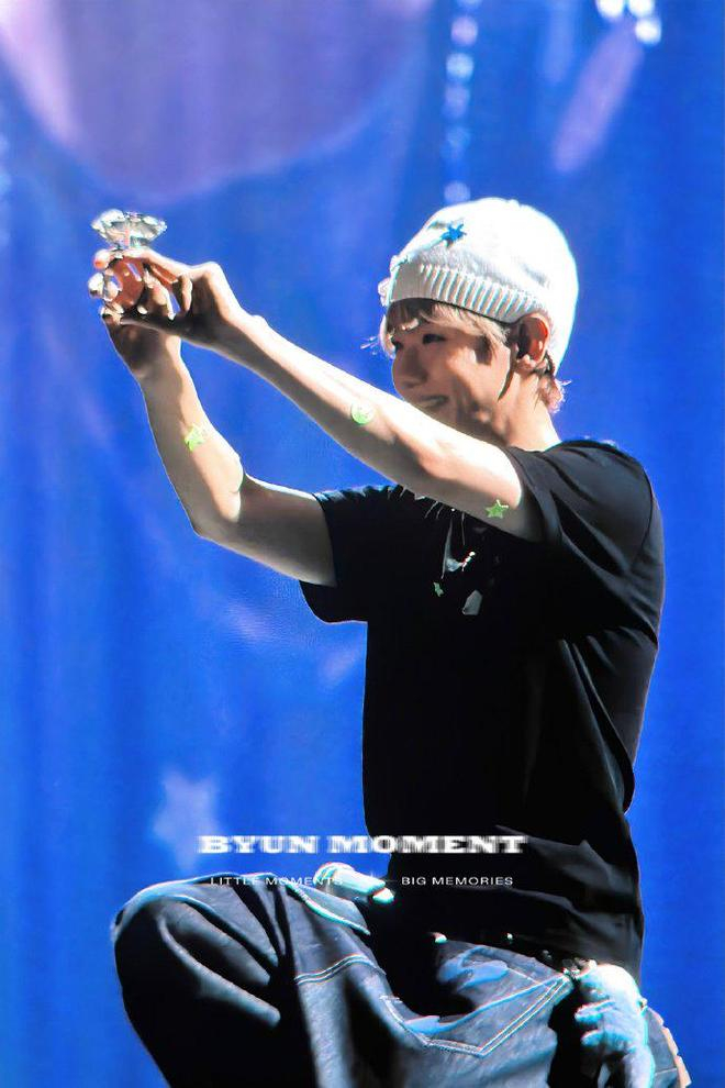 边伯贤还调侃钻戒道具“特别重”,但仍坚持将其戴在手臂上与粉丝互动。为照顾舞台两侧视线受限的观众,他主动增加多次合照机会,细节处尽显贴心。当粉丝高喊“老公”时,他用中文害羞回应“老婆”,随即捂嘴转身、耳朵泛红,强装镇定的模样引发阵阵笑声。