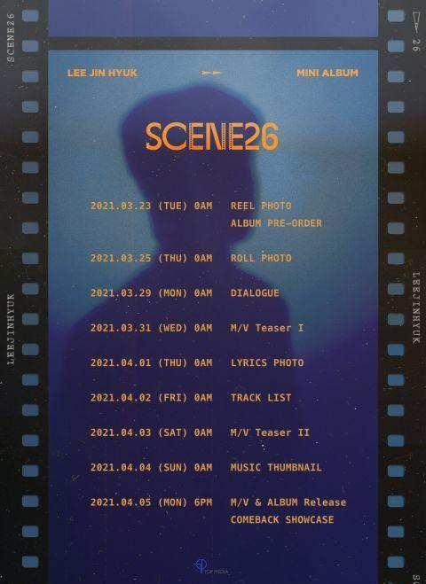 TOPMedia今天(19日)透露李镇赫将於4月5日发表第三张个人迷你专辑〈SCENE26〉,同时公开了从下周开始到发片前的详细行程。