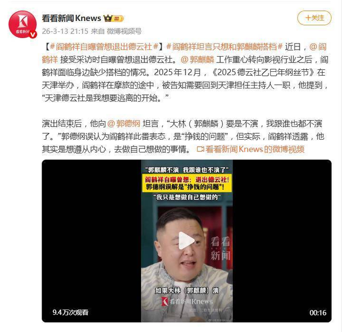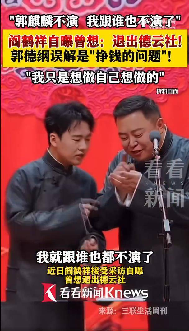 阎鹤祥自曝曾想退出德云社,坦言只想跟郭麒麟搭档,被郭德纲误会是钱的问题