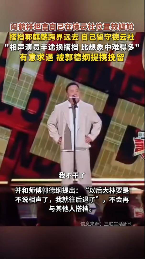 最近,德云社的阎鹤祥在一次采访中的坦白,引发了广泛关注,揭示了他与相声搭档郭麒麟单飞后所面临的职业困境。阎鹤祥透露,郭麒麟专注影视事业后,他一度陷入了相声失业的状态,甚至曾产生过退出德云社的念头。更让人意外的是,他曾说过一句话:大林要是不演,我跟谁也不演了。这番话在曲艺圈和粉丝中激起了巨大波澜,一时间误解四起,师父郭德纲也误以为这仅仅是因为挣钱的问题。