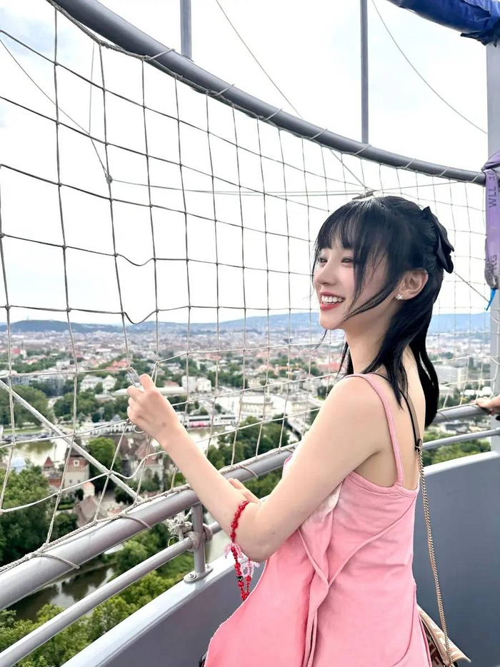 宋雨琦布达佩斯美照曝光,粉色吊带裙显纤细美腿,嘟嘴卖萌甜度爆表