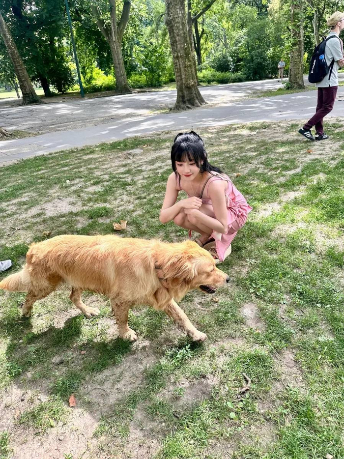 这次发布的旅拍照片中,宋雨琦身穿一袭粉色吊带裙,展现出迷人的优雅与青春气息。在一张照片里,她坐在公园的长椅上,悠闲地享受着惬意时光,修长的美腿格外引人注目。另一张照片中,她蹲在地上与一只温顺的大金毛犬互动,妆容精致,五官立体,红唇时尚迷人。还有几张错位拍摄的趣味照片,她双手高举,仿佛在推着热气球,俏皮又可爱,侧颜轮廓分明,上围曲线优美,整个人神采奕奕。